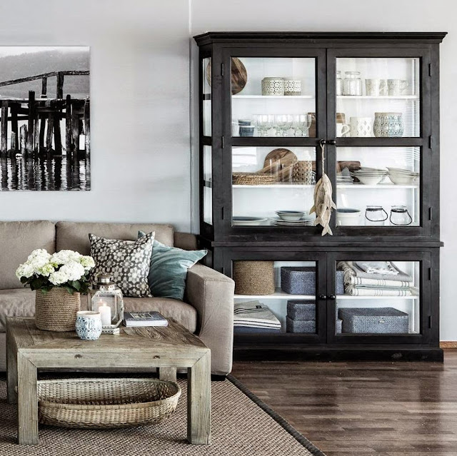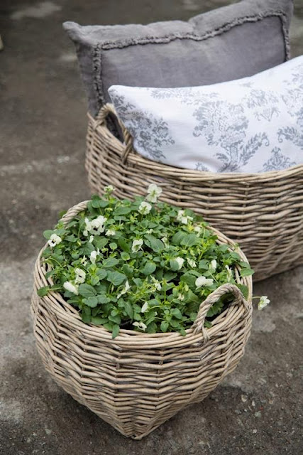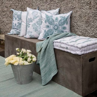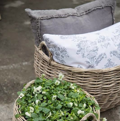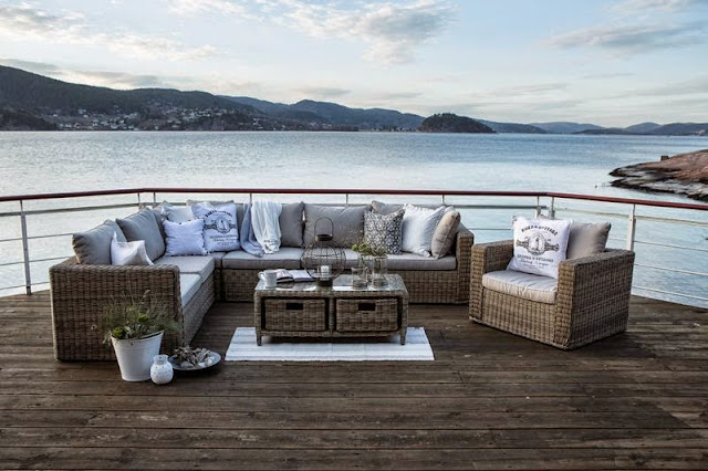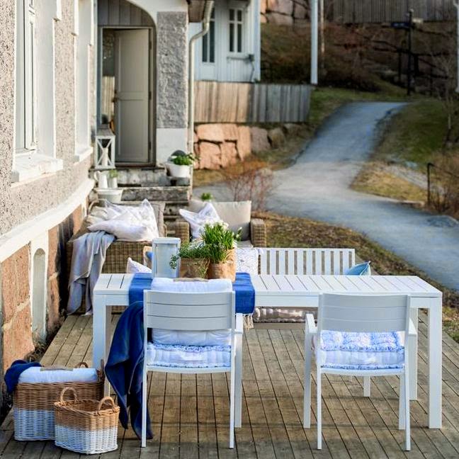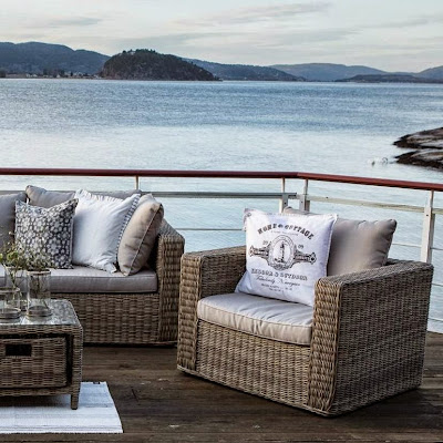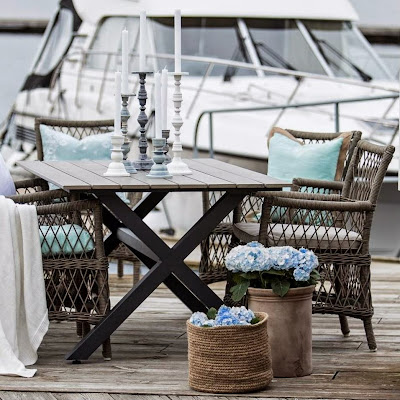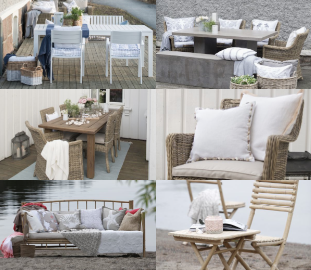 Holmsbu spisebord i grå aluminium, L160xB90xH72 cm 3995,-. Sardinia stol i åpen kurv med sittepute 2395,-. Anine pledd i hvit, 125x150 cm 399,-. Classy bokspute i aqua, 40x40 cm 99,-. Bandana putetrekk i aqua, 50x50 cm 99,-. Porto putetrekk i aqua med jute kant, 50x50 cm 149,-. Flettet kurv i jute fra Lama 249,-. Garda krukke i terracotta, Ø38xH44 cm 399,-. Emaljerte lysestaker fra Lama, 99,- til 249,-
