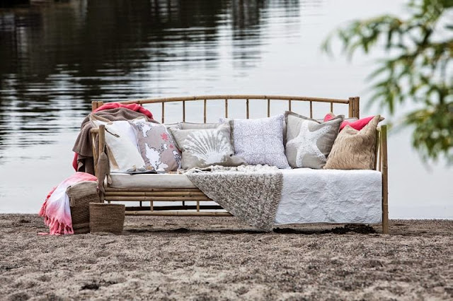 Jacarta daybed i bambus med puter, B200xD138xH100 cm 6995,- Flettede kurver fra Lama, meduin 249,- stor 299,- Boho toalettmappe 199,- Tye and Dye badehåndkle, 90x180cm 399,- Fra venstre: Luxury pledd i beige, 125x150cm 499,- Anine pledd i coral, 125x150cm 399,- Porto putetrekk i hvit med jutekant, 50x50cm 149,- Turtle putetrekk, 50x50cm 99,- Seashell putetrekk, 50x50cm 149,- Summerlove putetrekk, 50x50cm 149,- Seastar putetrekk, 50x50cm 149,- putetrekk i grovflettet jute fra Lama, 50x50cm 299,- Porto putetrekk i coral med jutekant, 50x50cm 149,- Sandy pledd i beige, 125x150cm 499,- Mille hvitt sengeteppe, 160x240cm 599,-