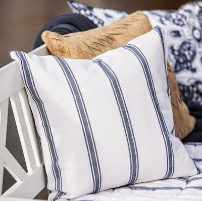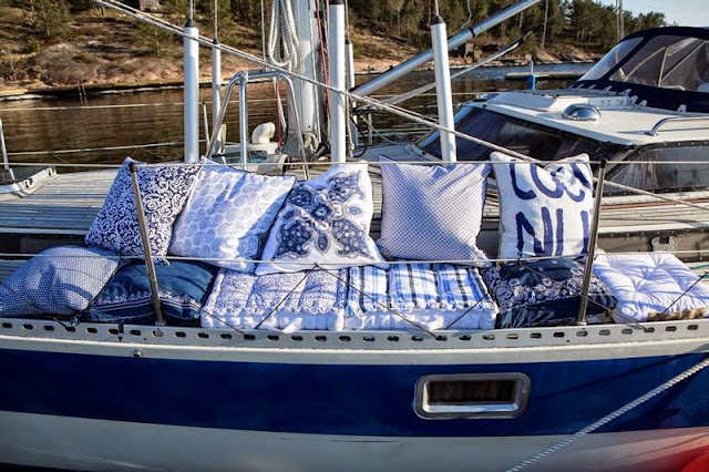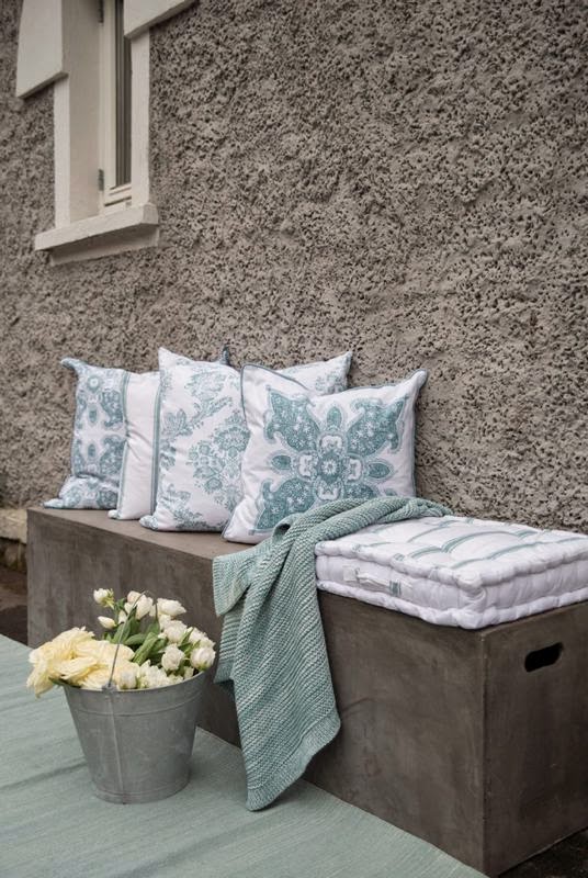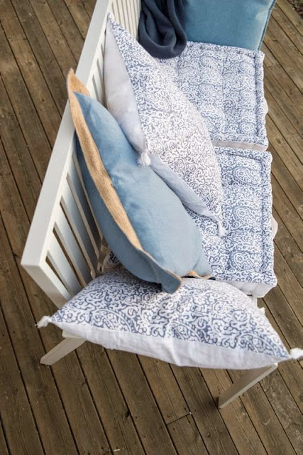 I benk: Jessie putetrekk i mørk blå med broderi, 50x50 cm 199,-. Summer House ornament putetrekk, 50x50 cm 99,-. Putetrekk i grovflettet jute fra Lama, 50x50 cm 299,-. Summer House stich putetrekk, 60x60 cm 129,-. Summer House stripet bokspute, 50x50 cm 199,-. I stol: Summer House classic putetrekk, 60x60 cm 129,-. Jessie bokspute med broderi, 50x50 cm 249,-.