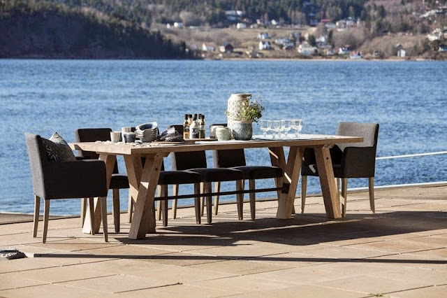 Lyngør hagegruppe i hvit eucalyptustre med FSC sertifikat: Stol B63xD73xH87 cm 1895,-, benk B165xD73xH87 cm 2495,-, bord L165xB92xH75 cm 3695,-.