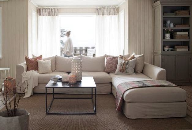 Stavern modulgruppe i flettet kurv med puter, kan settes sammen på ulike måter, 4-seter, 5-seter hjørne og som vist oppsett: 2-seter med chaiselong, total str.243x185cm 13495,- fås også i omvendt oppsett. 2-seter 7000,-, hjørne 4995,- chaiselong 6495,- Stavern sofabord, 88x88xH30cm 3995,- På gulv: Smarty oppbevaringsposer, 20x20xH25cm 129,-, 30x30xH35cm 199,- Estrella putetrekk med stjerner, 50x50cm 99,- Daisy blå sjøgresskurver, fire størrelser fra 79,- til 229,- I sofa: Anine pledd i hvit, blå og coral, 125x150cm 399,- Putetrekk fra venstre: Canvas i mørk blå Lama, 50x50cm 279,- Estrella orange med stjerner, 50x50cm 99,- Leaves pink, 40x60cm 99,- Tassel med røde dusker, 40x40cm 129,- Bandana i blå og coral, 50x50cm 99,- På bord: Ocean og Sander krus 19,- Bird dekor i jern 79,-